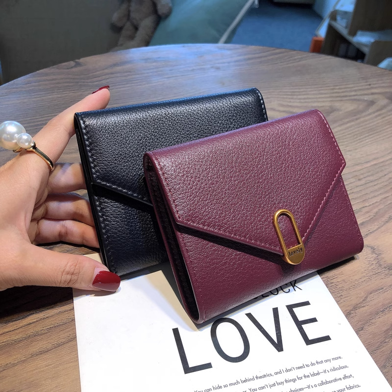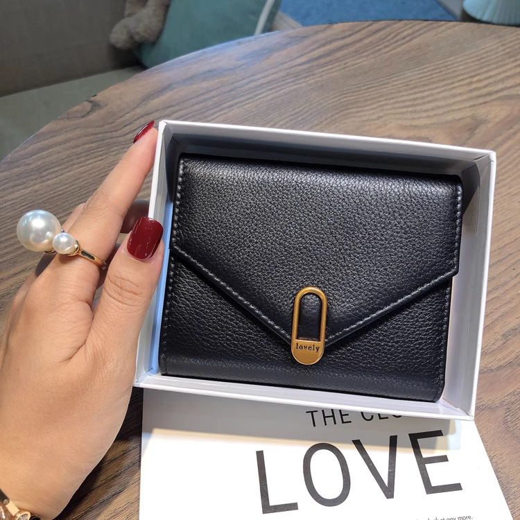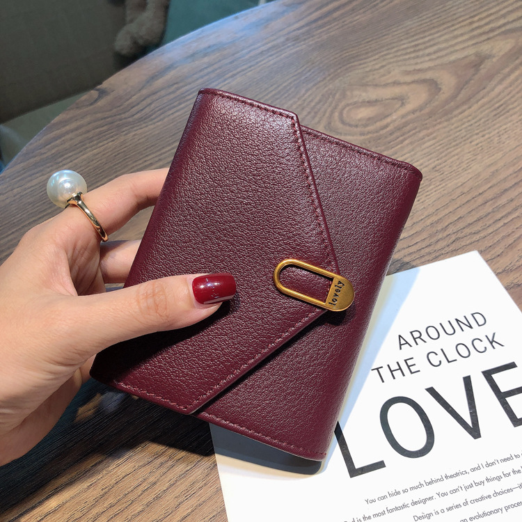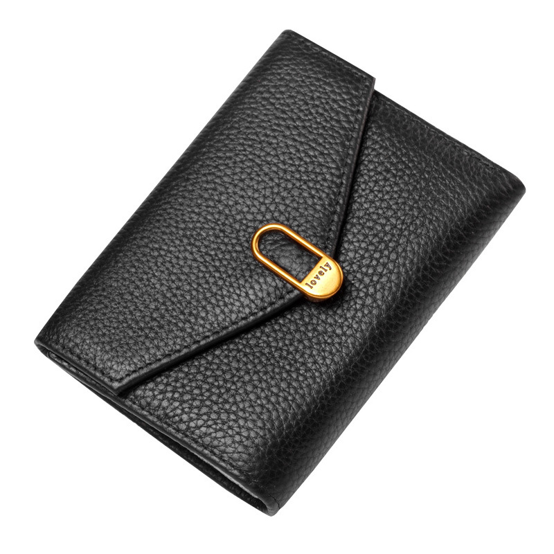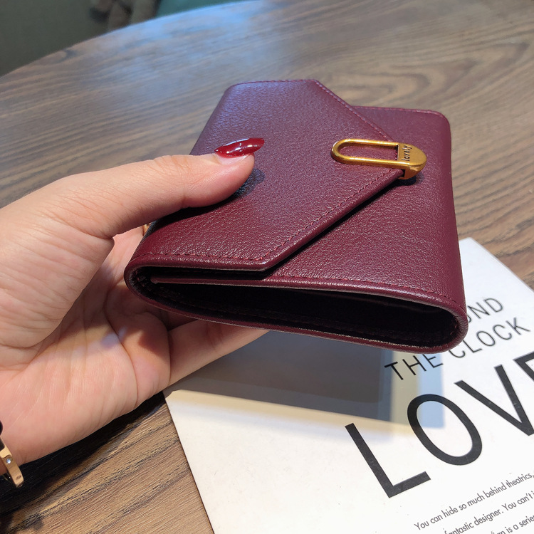 封筒のような美しいフラップデザインと、中央の金具がアクセントになった洗練されたデザインが特徴です。