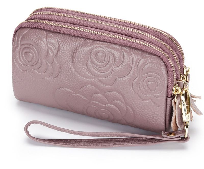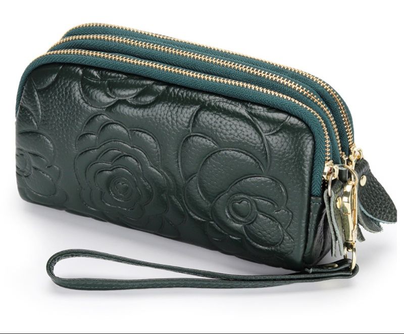 エレガントな薔薇の花柄を型押しした上質な本革仕様のレディース二つ折り財布です。 三層のラウンドファスナー構造で小銭やカード、お札を整理整頓して収納できます。 取り外し可能なストラップ付きで持ち運びも便利です。 柔らかな革の質感と立体的な花柄が女性らしさを引き立て、普段使いから特別な日まで幅広くお使いいただけます。